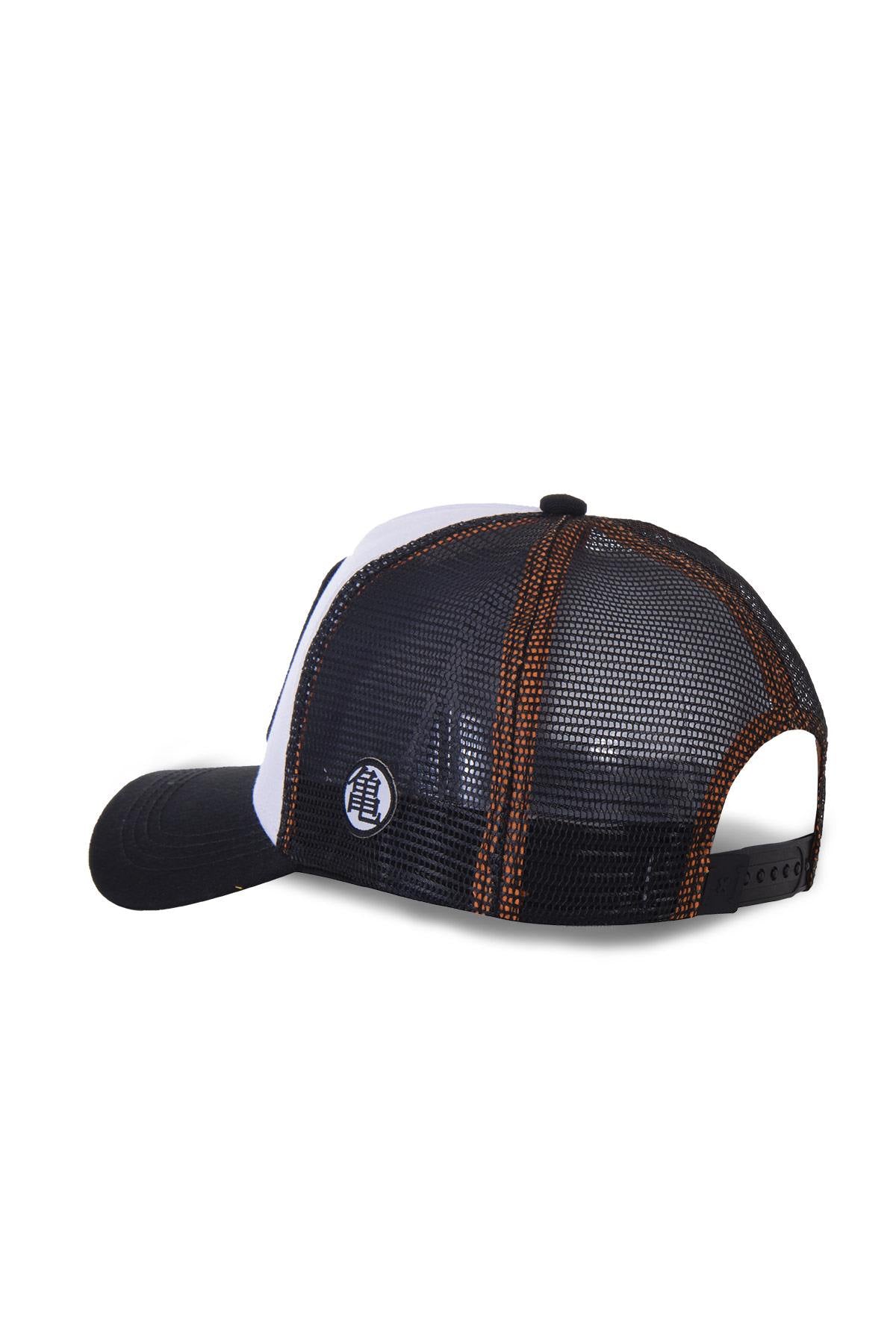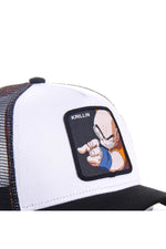 Den främre delen är gjord av bomull i en vit färg som står i kontrast till den andra. förundras med det svarta i det broderade bandet på vilket den lilla munken Krillin är representerad. Visiret är vanlig svart liksom den perforerade bakdelen. En liten etikett flockas på sidan av locket. vänster om kepsen och bär karaktärens namn på japanska. Knäppningslåset à Baksidan gör att du enkelt kan justera huvudstorleken.