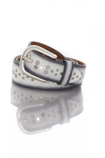 Vit färg med grå kanter och dekorativ utsmyckning. med silverfärgade nitar kommer detta Vanzetti-bälte att se bra ut med jeans.