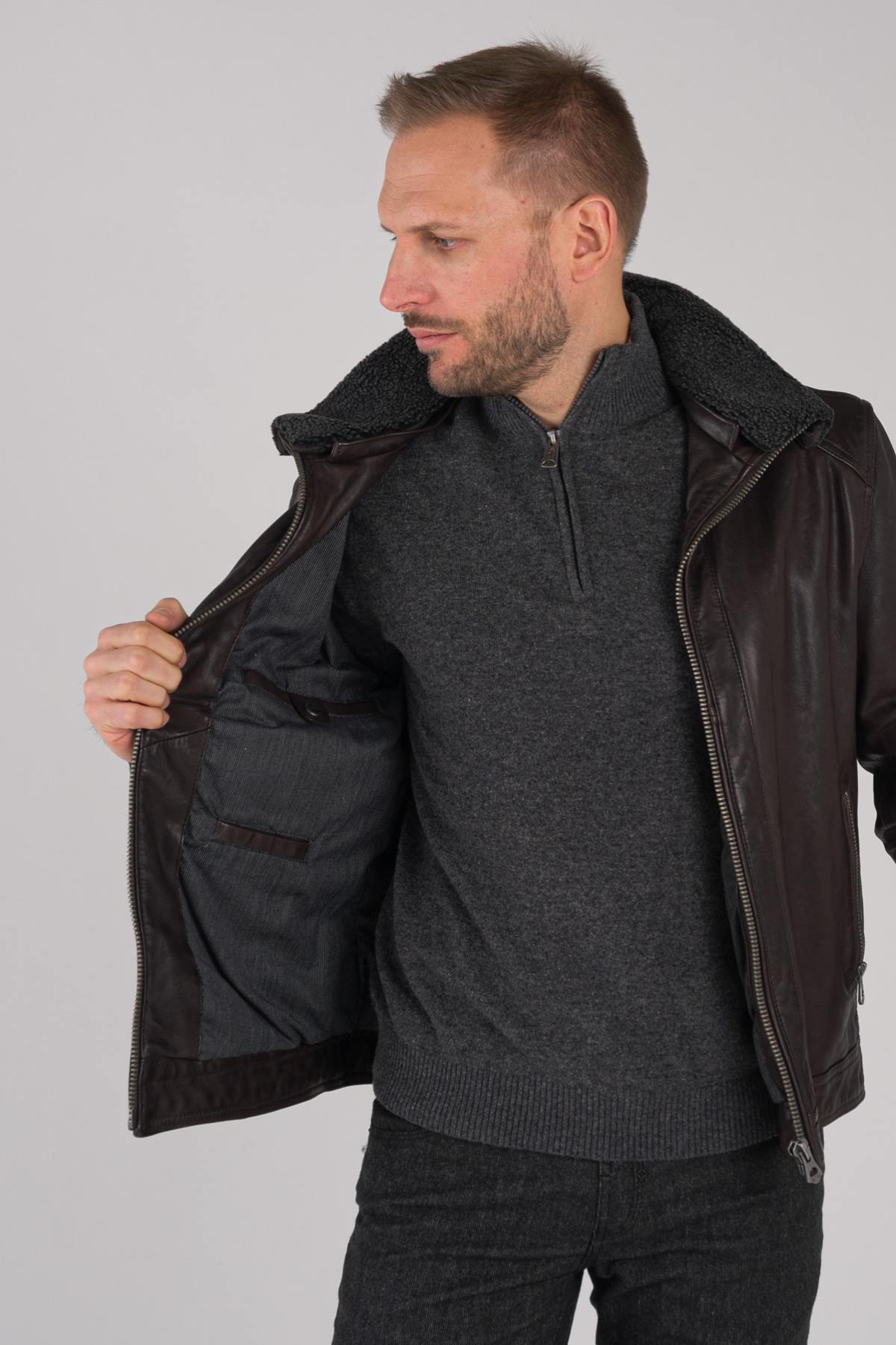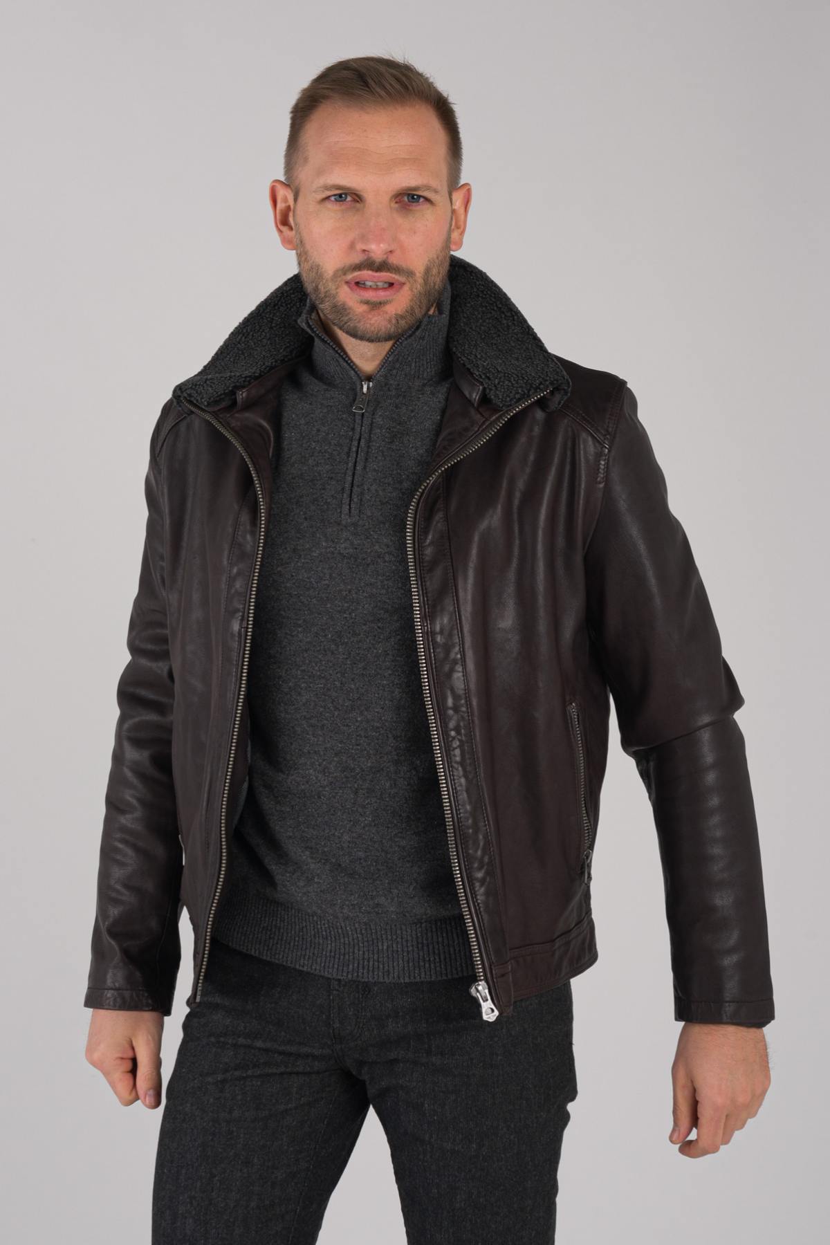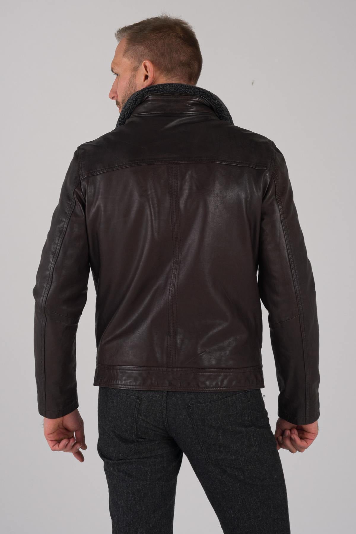 Dark brown leather jacket with fur collar - Image n°8