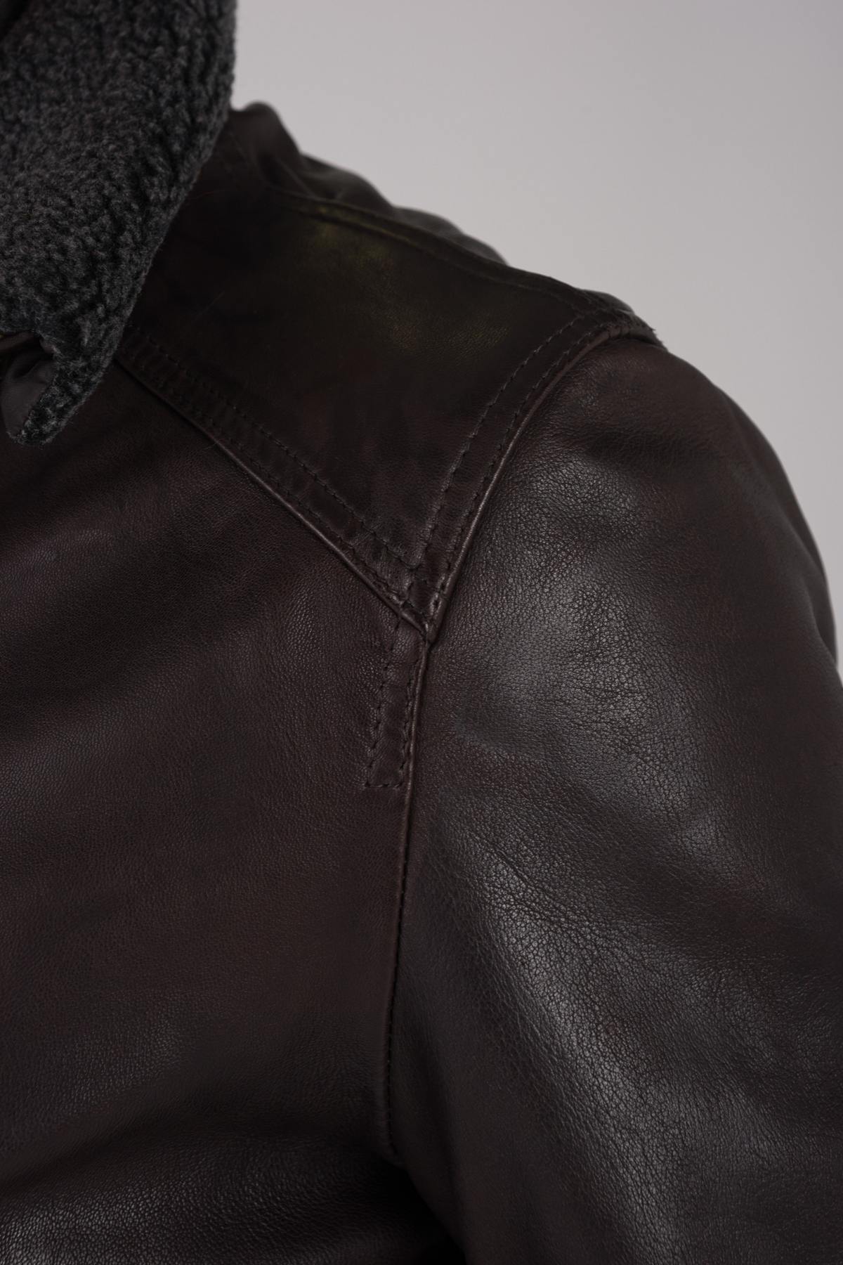 Dark brown leather jacket with fur collar - Image n°7