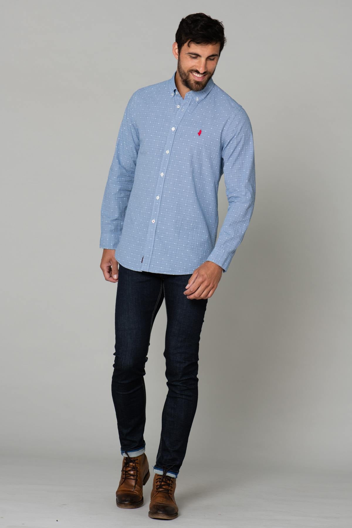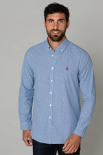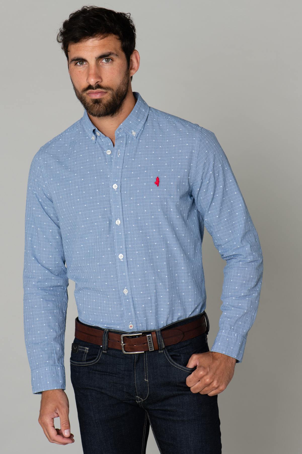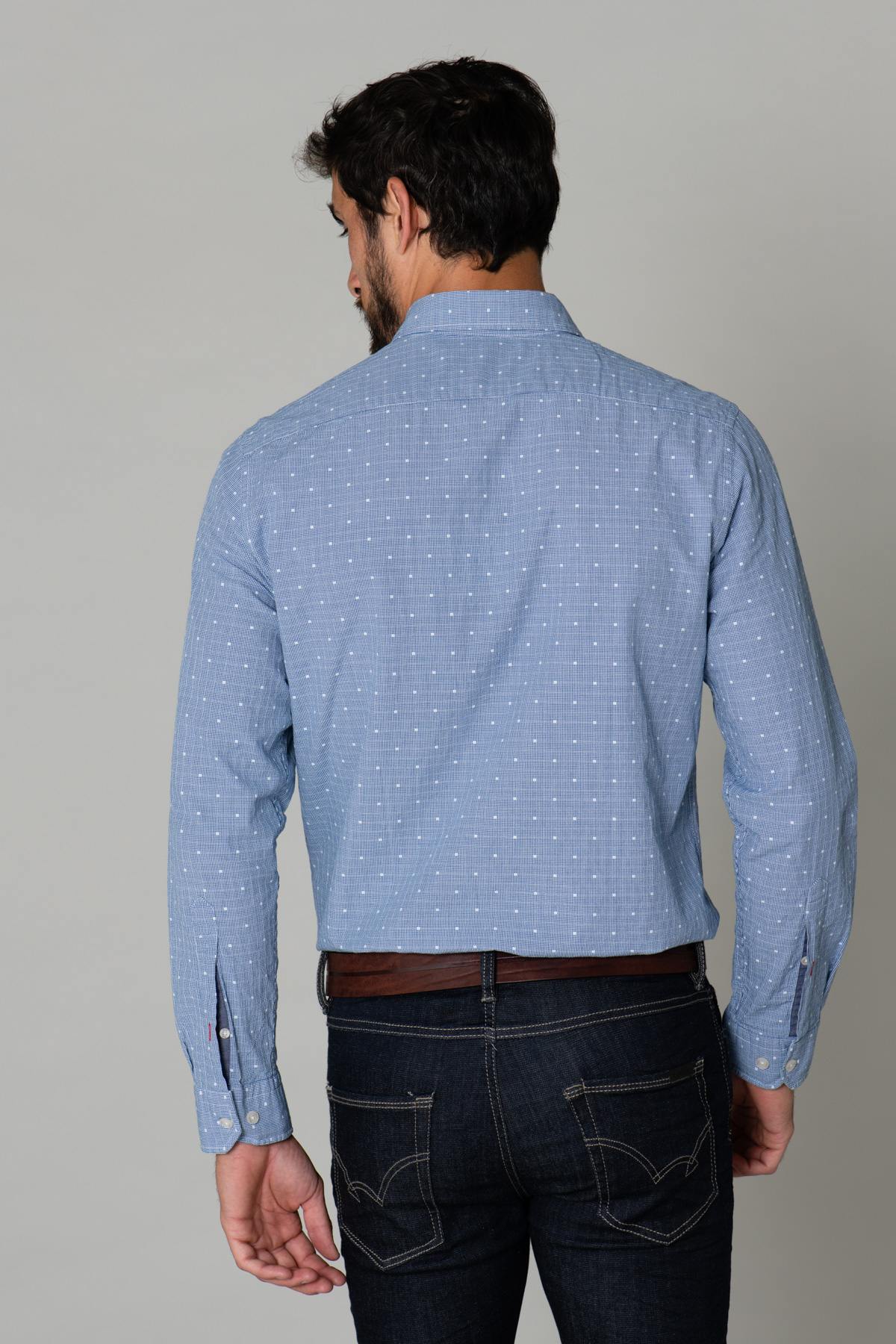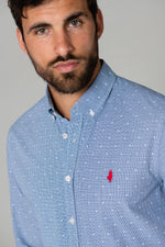 Den här skjortan har en enkel krage med knäppning och stängs axiellt med vita knappar. Den blå färgen kompletteras av filigranplattor och små vita prickar täckta över hela ytan. De långa ärmarna stängs även med vita knappar. Märkets röda logotyp är broderad. på sidan vänster bröst.