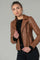 Denna bisonfärgade perfecto är något åldrad för att få en mycket chic och trendig vintageeffekt. Dess höga skärning framhävs av den långa excentriska metalldragkedjan. till höger, medan ytterligare en dragkedja pryder sidan. VÄNSTER. Dragkedjor finns också vid de två sidfickorna och i ändarna av de långa ärmarna. En slagskeppseffekt ges på axlarna, sidorna och baksidan av denna skinnjacka. Vilket ger den en viss charm värdig löparjackor.