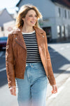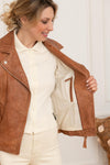 I fårskinnsläder är denna perfecto flexibel. Dess foder är tillverkat av bomull och polyester, det är mycket behagligt att bära. bära varje dag.