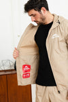 Resår i midjan och i ändarna av de långa ärmarna, denna beige jacka stängs längs axeln med en lång metalldragkedja. En stor huva justerbar med en svart elastisk snöre finns vid halsringningen. Två dolda fickor som kan stängas med en metalldragkedja är placerade på varje sida. En snygg söm är gjord på baksidan, medan varumärket och logotypen flockas i vitt på sidan. vänster bröst.