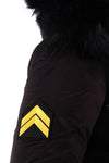 Fluffad huva dekorerad med magnifik svart tvättbjörnspäls, avtagbar med tryckknapp.