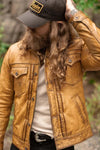 Förkroppsliga den amerikanska guldåldern med GOLDRUSH-jackan från Master, en pjäs som återupplivar andan i naturen med sitt patinerade konjakbuffelläder och vintage trucker-estetik.