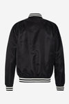 Den svarta färgen på denna bomber är snyggt kontrasterad av de vita och svarta ribbade banden som sys vid kragen, ändarna på de långa ärmarna och storleken. En lång metalldragkedja och tryckknappar säkerställer stängning längs axeln. Två raglanfickor är placerade på varje sida, medan varumärket är broderat. i vitt på sidan vänster bröst.