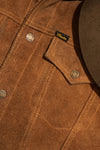 A rugged and authentic men's trucker jacket, the Lonestar by Master Supply Co. is crafted from full-grain cowhide in raw brown with a contrasting full-grain buffalo leather collar in dark brown for a distinctive vintage look.