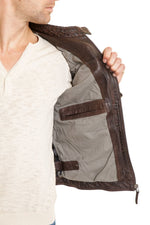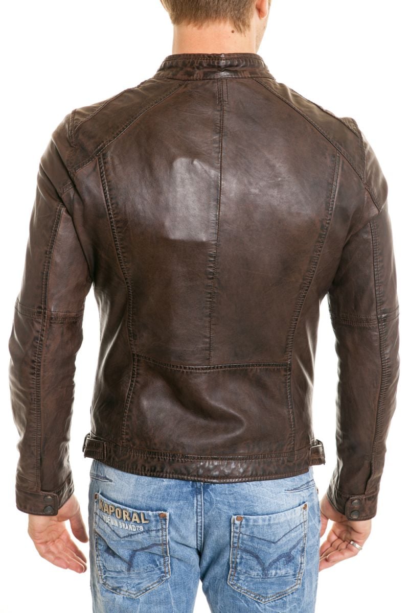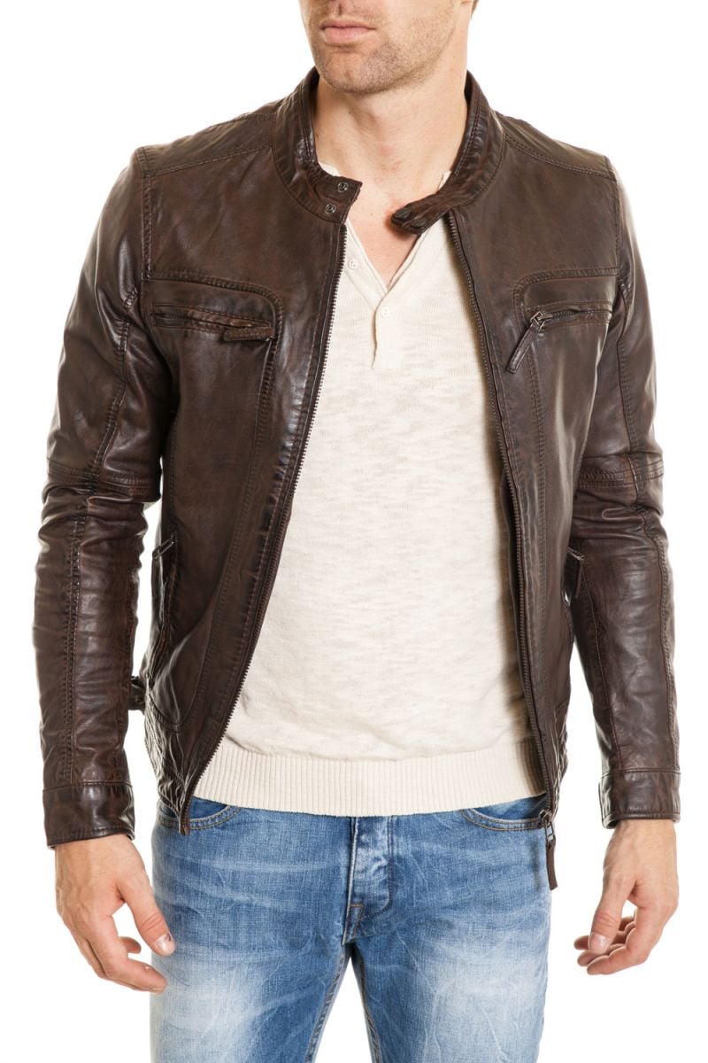 Denna bruna skinnjacka i ekträ har ett åldrat och patinerat utseende. Han har mycket karaktär. Dess lätt passande snitt gör den idealisk för längre figurer.