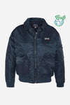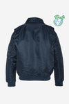 Denna tidlösa bomberjacka är gjord av återvunnen nylon, vilket säkerställer både lätthet och hållbarhet. Den har en dragkedja fram, samt två cargofickor på framsidan och två innerfickor för extra bekvämlighet. Det stickade midjebandet och ärmsluten säkerställer en perfekt passform och bra skydd mot kylan. Dess marinblå nyans gör den till ett mångsidigt plagg, perfekt för att komplettera alla avslappnade outfits.