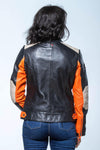 Orange, black and ecru biker collar leather jacket - Image n°3