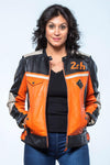 Orange, black and ecru biker collar leather jacket - Image n°1