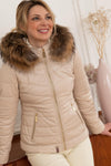 Fårskinnsläderkonstruktionen erbjuder kvalitetsläder, med avancerad finish. Modellen är böjd; och presenterar omedelbart din siluett i sitt bästa ljus. Den avtagbara kragen har dragkedja. och kantad med naturligt färgad tvättbjörnspäls. Den centrala stängningen är med dragkedja och guld, liksom de 2 nedre snedställda fickorna. Inuti finns 2 fickor, varav en med dragkedja. Fodret är en av de viktigaste tillgångarna i denna modell, med sin vadderade polyester och Thinsulate-teknologi.