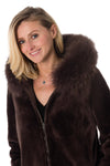 Denna shearling-jacka är perfekt för alla kläder. merino har en fast huva dekorerad med superb tvättbjörnspäls som är väldigt mjuk vid beröring.