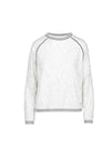 Dess krage, ärmslut och fåll är i randig ribb. vit och svart. Tonerna av svart flockades på vissa delar av denna sweatshirt i kontrast till den andra. fantastisk med sin vita färg och spetsiga utseende. Ett lätt foder är sytt på insidan. inuti för att förhindra att tröjan är genomskinlig.