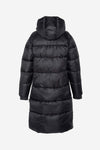 Denna extra långa quiltade dunjacka är gjord av högkvalitativ nylon, som ger utmärkt isolering mot kyla samtidigt som den förblir lätt. Den glänsande svarta färgen lägger till en touch av elegans som lätt passar ihop med allt. Den har två praktiska fickor med dragkedja framtill, en robust central stängning och en huva för optimalt skydd mot väder och vind. Interiören är fodrad med beige nylon, vilket skapar en subtil och elegant kontrast. Dessutom förstärks den av en liten Schott-etikett i botten och en logotyp på armen, vilket bekräftar dess äkthet och kvalitet.