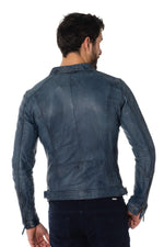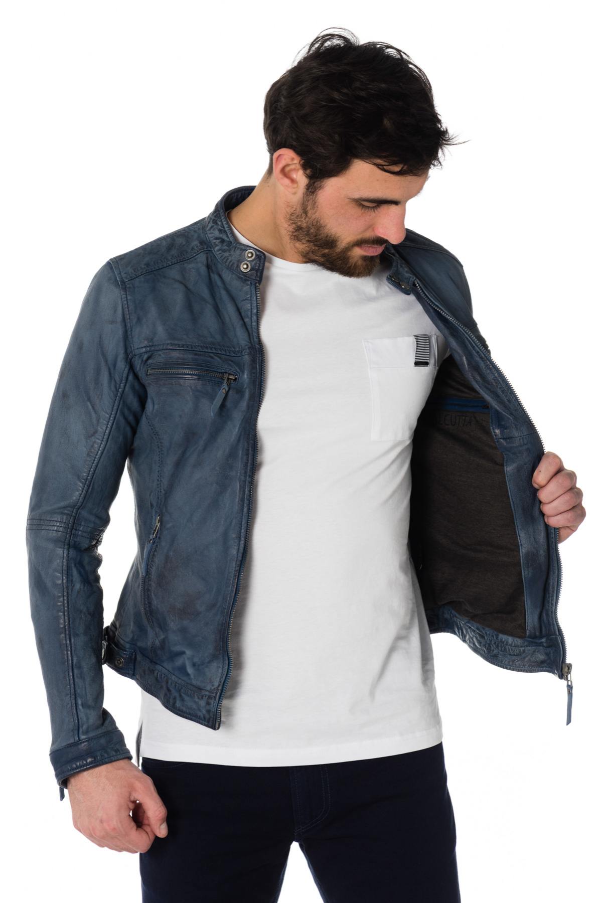 Denna blå läderjacka av fårskinn, fodrad med... gjord av mycket bekväm stretchjersey, har en väldigt trendig åldrad effekt.