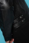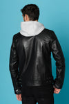 Denna buffelläderjacka, tjock och slitstark, har en huva med sweatshirteffekt monterad på en avtagbar dragkedja.