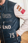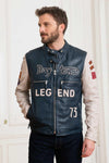 Rapid Lamb Vita-jackan Daytona Short Blue är gjord av vegetabiliskt garvat lammskinn, som erbjuder en mjuk struktur och optimal komfort. Denna jacka kännetecknas av sin runda biker-snäppkrage och sin djärva tvåfärgade design. Kavajens kropp är djupblå, dekorerad med en stor "Daytona Legend"-inskription som ger en unik touch. Ärmarna, i krämfärgat läder, är dekorerade med sex distinkta lappar som ger helheten karaktär. Med sina fyra fickor med dragkedja och dragkedjor på ärmarna kombinerar denna jacka funktionalitet och stil. Den senapsfärgade bomullsinredningen har en praktisk lappficka.