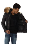 Huvan är avtagbar med dragkedja och den är utrustad med dragkedja. med naturlig tvättbjörnspäls som kan tas bort genom tryck.