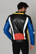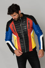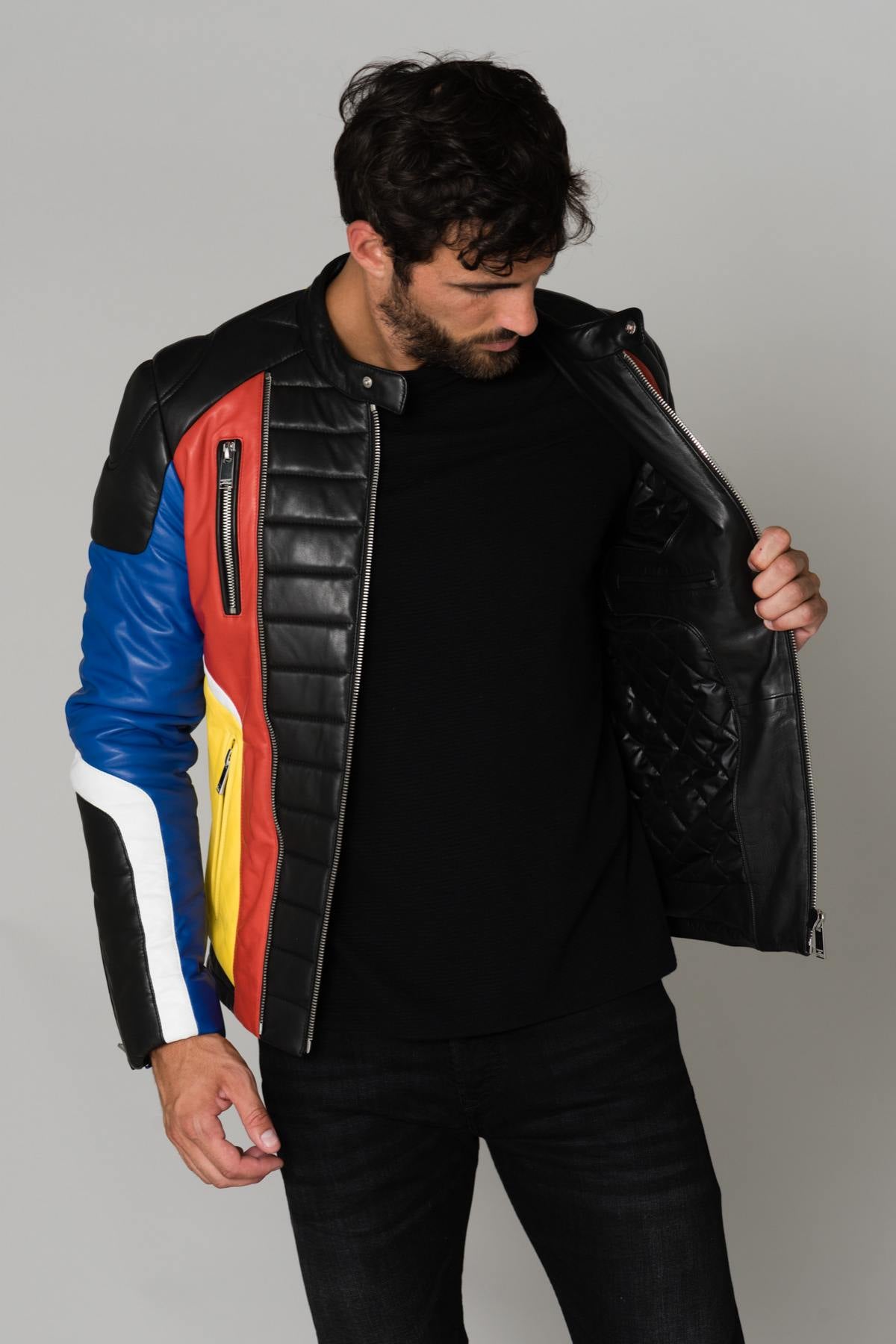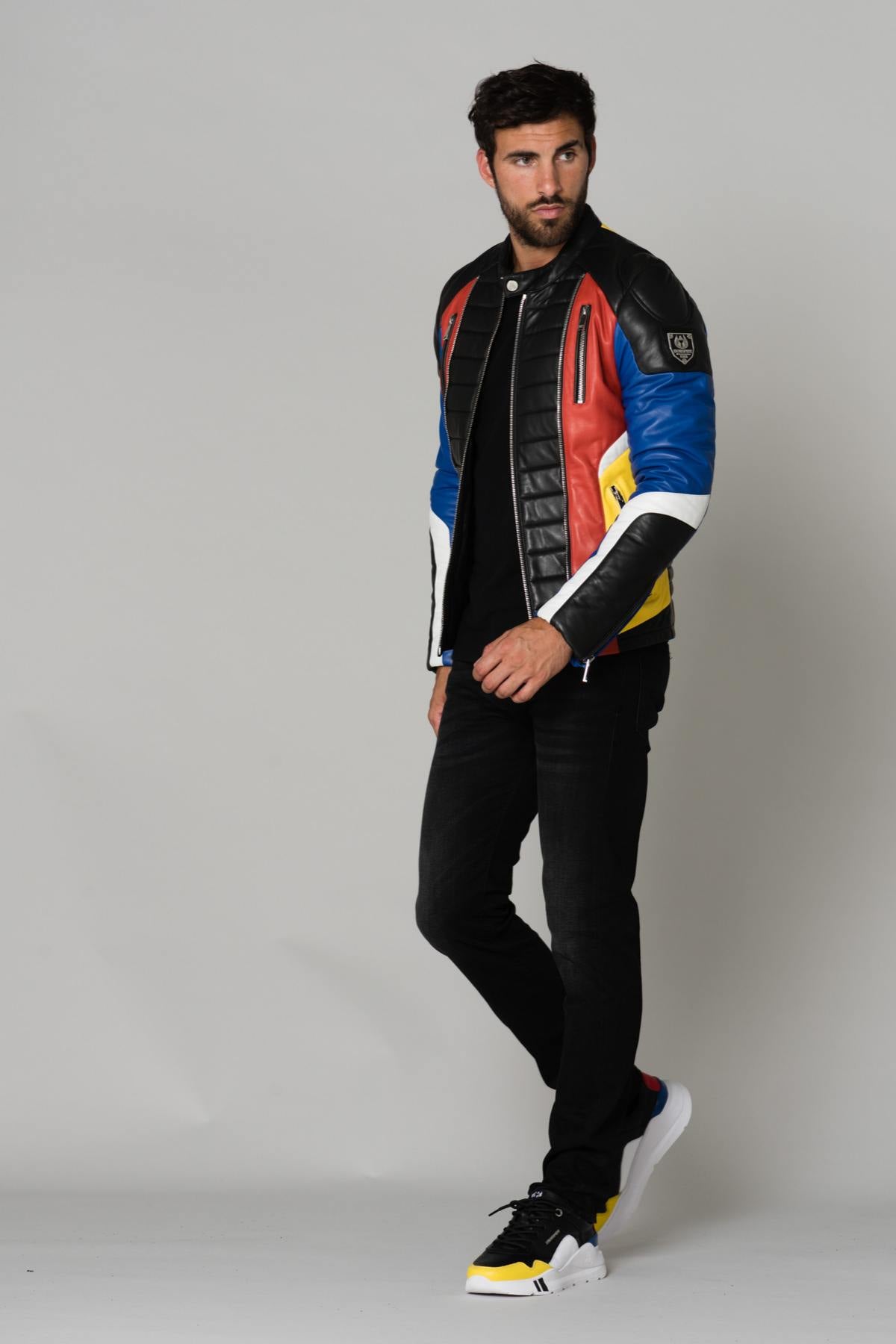Blå, svarta och vita färger på ärmarna och på framsidan röd, vit, gul och svart, denna modell är original och trendig. för en unik stil!