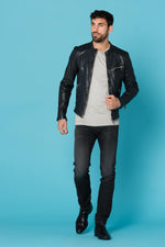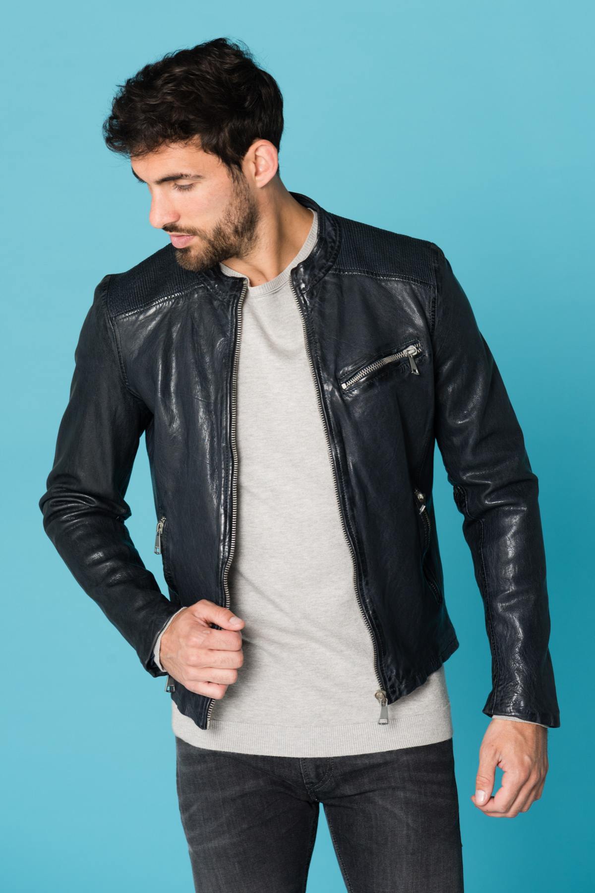 Redskins kombinerar rock- och bikerstil för denna marinblå läderjacka av fårskinn.
