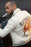 DRAGON COHIBA CREAM herrjacka från märket Redskins är en teddy gjord av vitt koskinn. Det är en jacka som passar alla årstider. Den har en vanlig eller rak skärning, lämplig för alla kroppstyper.
