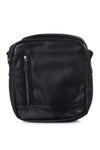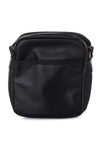 Denna svarta polyuretanväska har ett centralt fack med en öppen ficka och en ficka med dragkedja, ett kardborreband med dragkedja på baksidan.