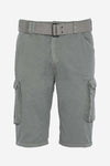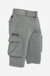 À Mid-knähöjd, dessa shorts har två stora fickor med dragkedjor. klaffar placerade på varje sida samt i nivå med skinkorna. Två andra fickor är också fästa på baksidan. framsidan. Dessa shorts stängs med dragkedja. en knapp och en metalldragkedja. Öglar sydda på midjan håller ett militärbälte, även det grått.
