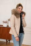 Happy 1 Leo dunjacka är gjord av fårskinnsläder, med quiltning vilket gör den till en varm och skön jacka. Detta är en kort jacka, med en fast huva klädd i tvättbjörnspäls för ett chict och glamoröst utseende. Dess termoreglerande fiber THINSULATE är en garanti för värme och lätthet. Dragkedjan är centrerad och åtföljs av 2 handfickor ovanför midjan. Det magnifika fodret tar hand om detaljerna i modellen, med sin snygga leopardeffektsyta.