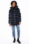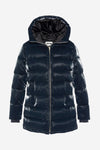 Long navy blue hooded down jacket with satin effect - Image n°1
