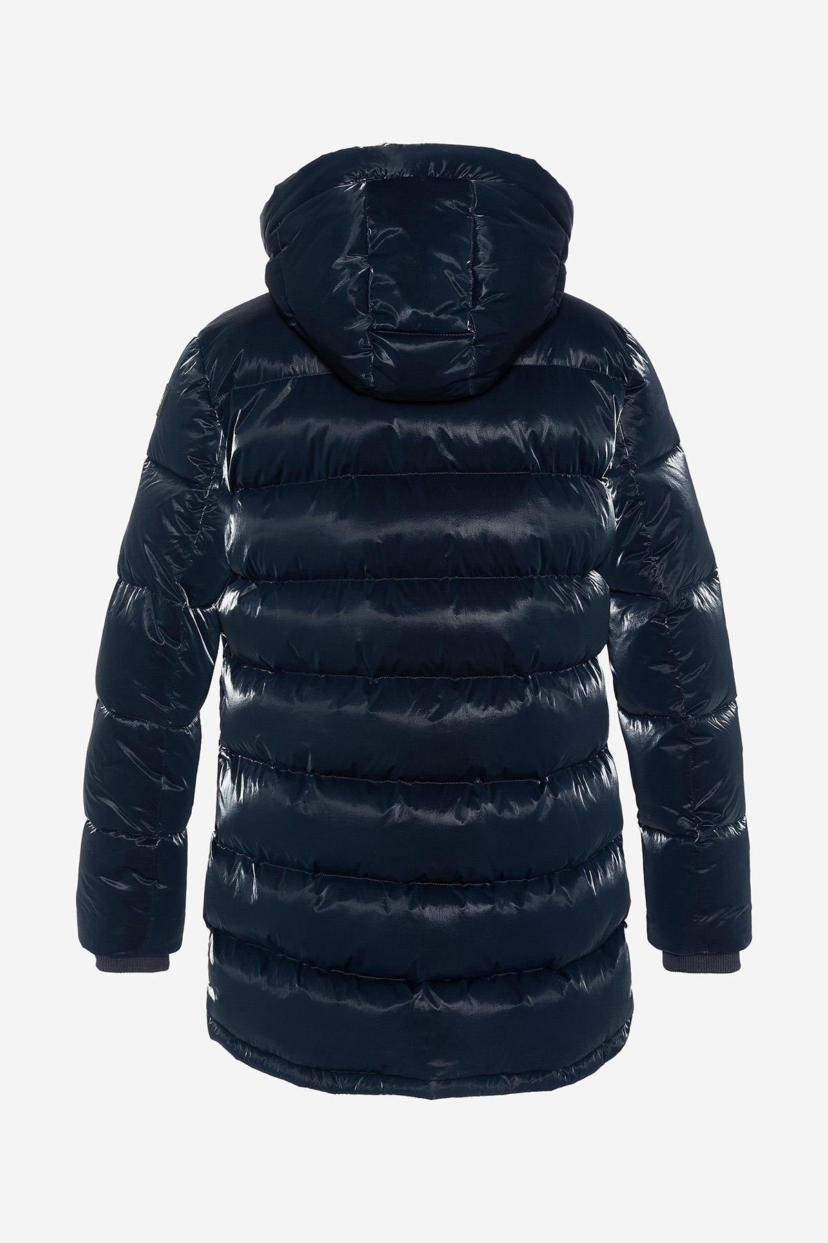 Long navy blue hooded down jacket with satin effect - Image n°4