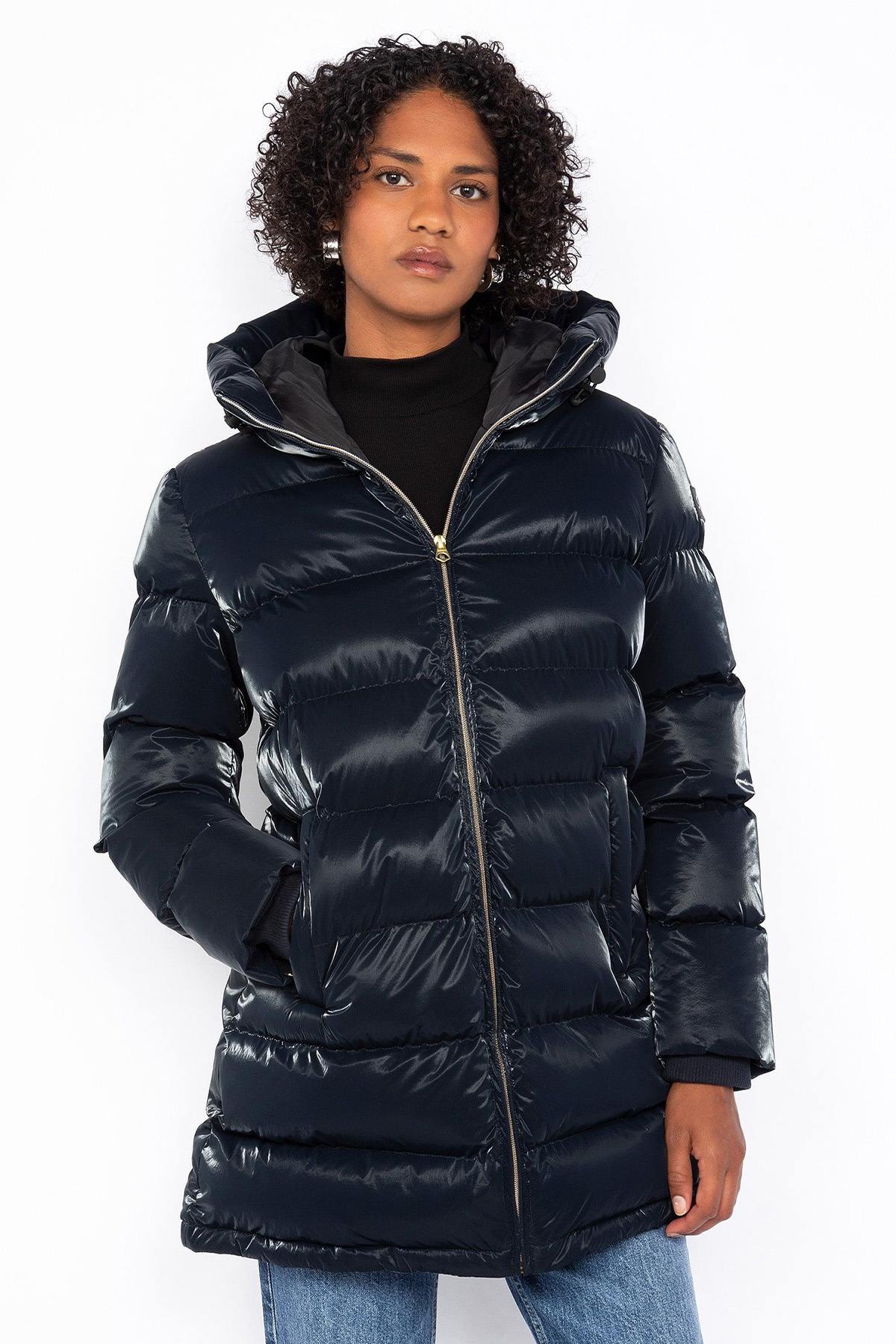 Long navy blue hooded down jacket with satin effect - Image n°1